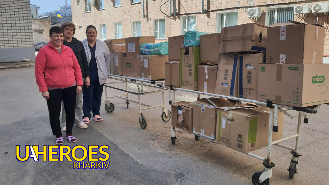 Over 500 kg of medical supplies from three European countries: surgical kits, colostomy bags, urine bags, systems, diapers, urological pads, sterile sets of consumables, vitamins, medicines, and more.